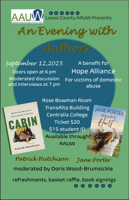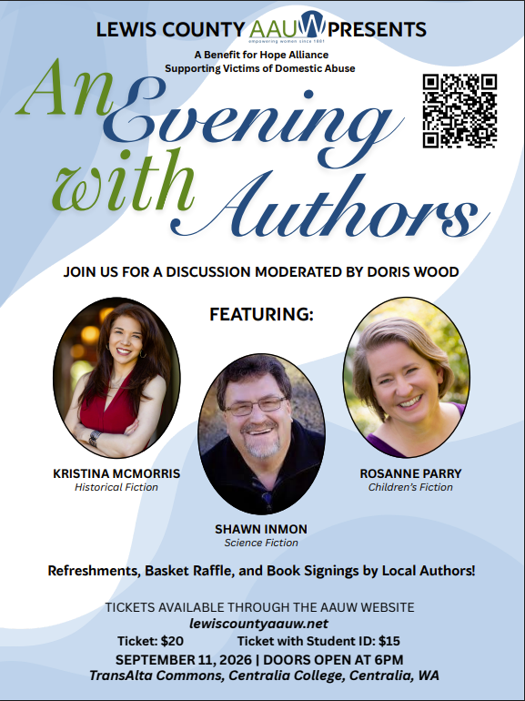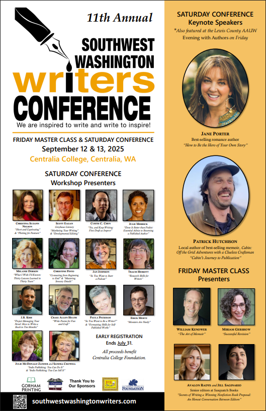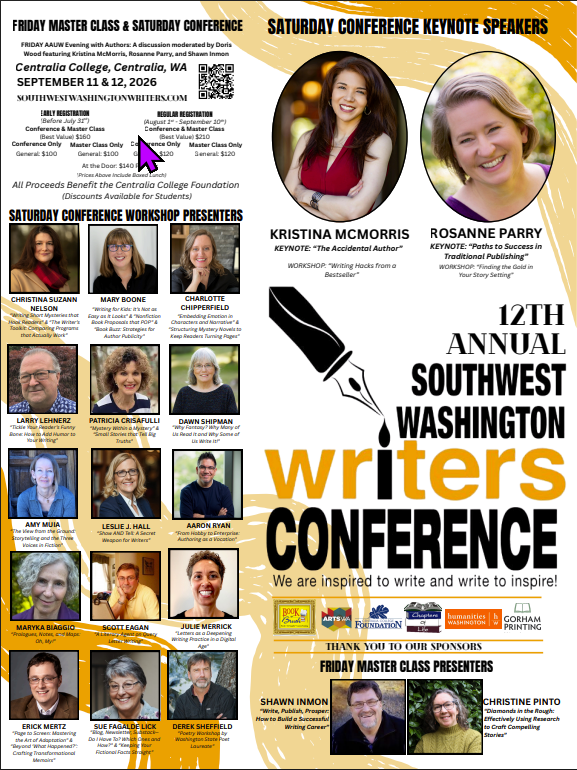 Since 2014, the Southwest Washington Writers Conference has provided writers with a craft-focused experience. Held at Centralia College, the event consists of master classes on Friday and opens on Saturday with a keynote speaker, followed by a day full of workshops. In 2024, the AAUW debuted its Evening with Authors on Friday night. This volunteer-run conference seeks to motivate, inspire, and encourage writers at all career stages.